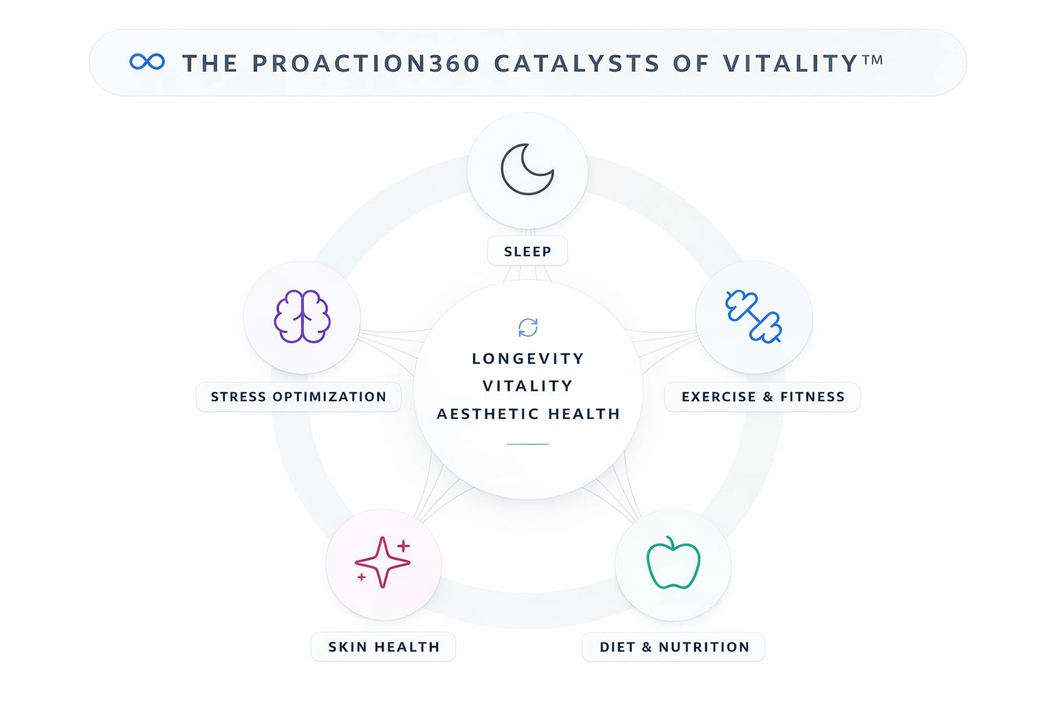 The Catalysts of Vitality™ reflects a 360-degree ecosystem of interconnected health drivers — because true vitality is built through balance and consistency, not extremes.